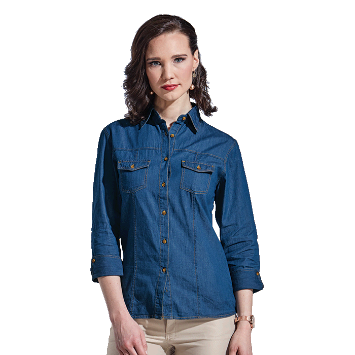 The Ladies Denver Denim Blouse is made from 100% Cotton dark denim fabric, 5 Oz. The features include a shaped hem for a flattering look, two-tone buttons, matching ladies denim blouse, patch pocket with flaps at the chest, constructed button stand, contrast top stitching, double layer back yoke, front and back panel lines, ¾ sleeve styling and turn-up cuffs. Regular fit.
