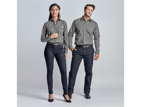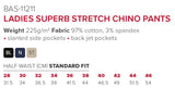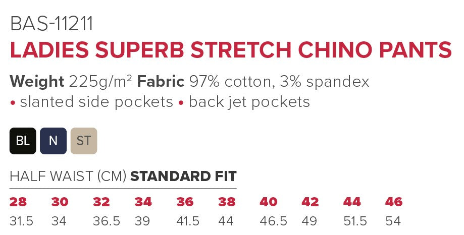 The Ladies Superb Stretch Chino Pants is both comfortable and stylish enough to wear in the office or on a night out! Made from 225g/m2 97% polyester and 3% spandex, the formal pants has slanted side pockets, back jet pockets and belt loops, giving you the option to finish off your look with a belt. Available in plain colors. Standard fit.