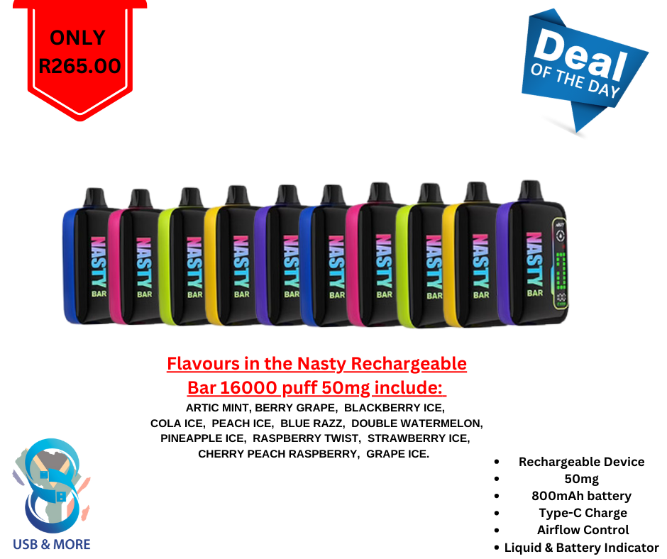 Taking things a step further, the Nasty Rechargeable Bar 16000 puff 50mg has improved airflow control. This really puts the power in your hands. There is a Eco mode, Normal mode, and Turbo mode.