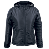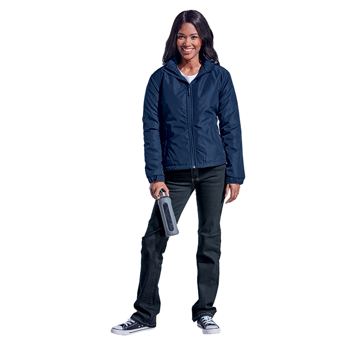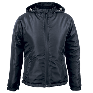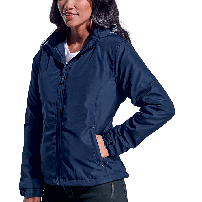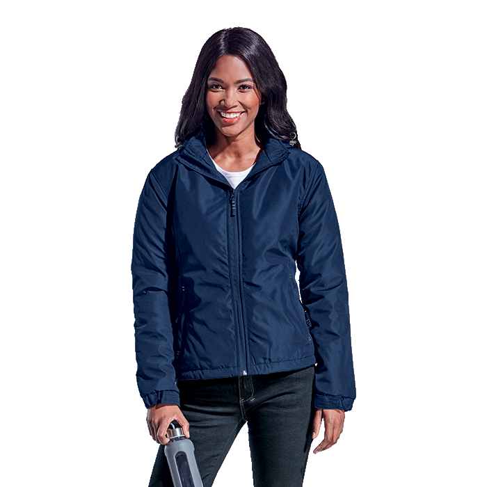 The Ladies Cooper Jacket is a fully lined jacket with soft padding making it the perfect winter wardrobe item! Made from 150g 100% coated polyester for water-resistant qualities, the jacket has an inner cellphone pocket, zippered pockets, full-length front zip with zip puller, adjustable and elasticated cuffs with velcro tabs to keep the heat in and the cold air out, contrast bar-tacks on the pockets and zip pullers and a removable hood with drawcord and toggle. Available in plain colours with contrasting colour stitch detail. Regular fit.