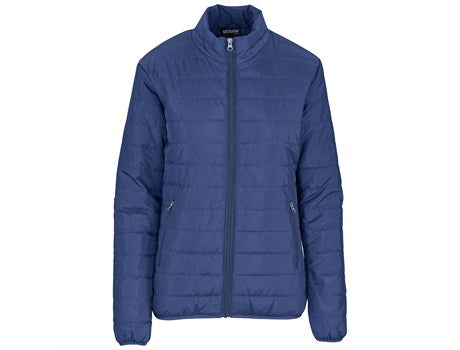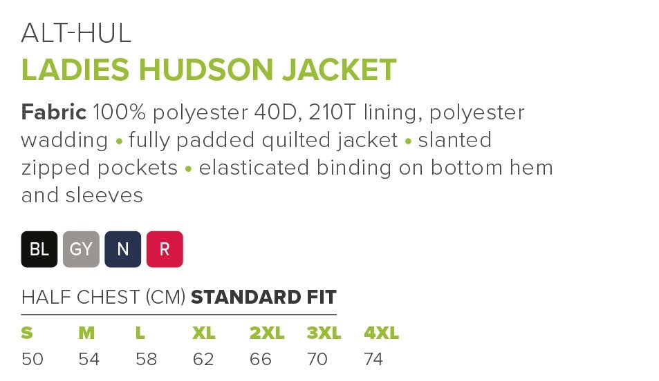 The Ladies Hudson Jacket is made from 100% polyester 40D and 210T lining. Fully padded quilted jacket with slanted zippered pockets and an elasticated binding on the bottom hem and sleeves with polyester webbing. Available in plain colors and lightweight enough to throw over any outfit.