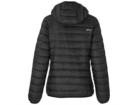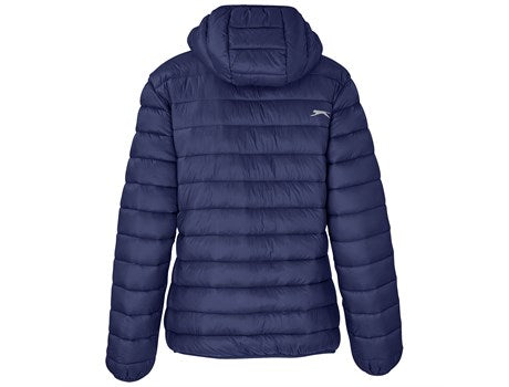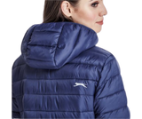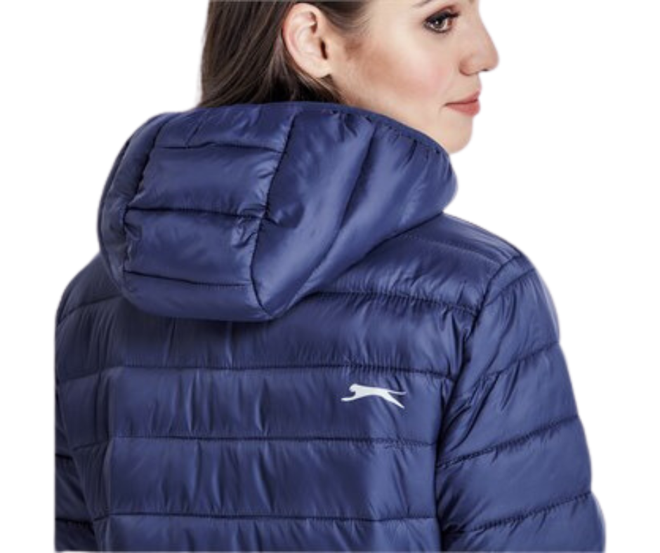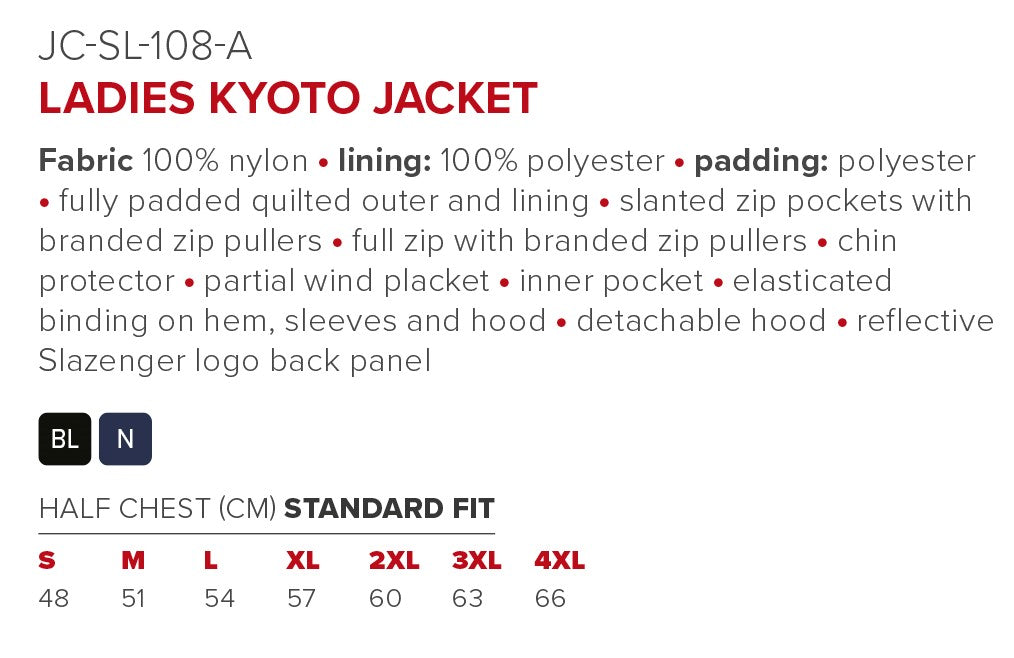 The Ladies Kyoto Jacket is made from 100% nylon with 100% polyester lining and padding. The fully padded quilted outer and inner jacket has a detachable hood, slanted zip pockets with branded zip pullers, chin protector, partial wind placket, inner pocket, a full front zipper, elasticated binding on the hem, sleeves and hood. Part of the Slazenger collection and has a reflective Slazenger logo on the pack panel. Available in plain colors. Standard fit.