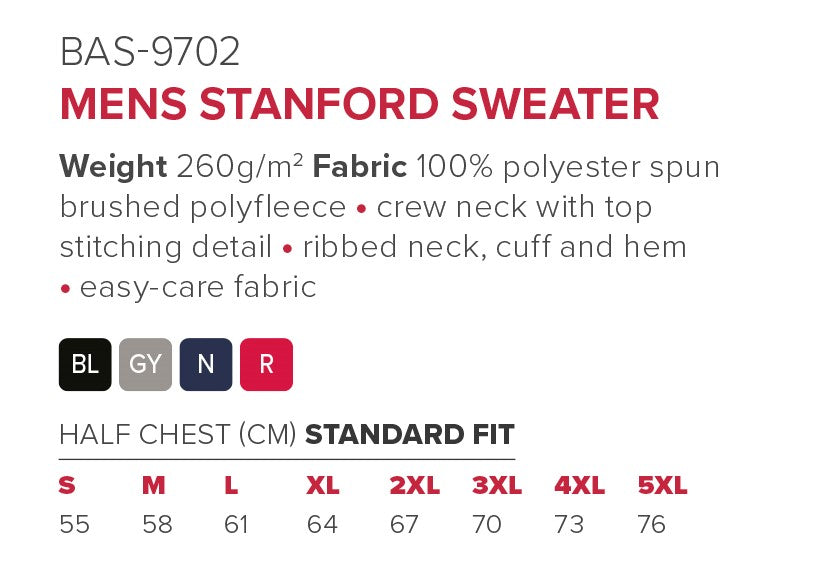 The Mens Stanford Sweater is made from 260gsm 100% polyester fabric in a jersey knit with a spun polyester fleece inner, a crew neck design with stitch detail, a ribbed hem, cuffs and neckline with a standard fit. It’s cost-effective, comfortable and can be worn for any occasion. Available in plain colors. Standard fit.