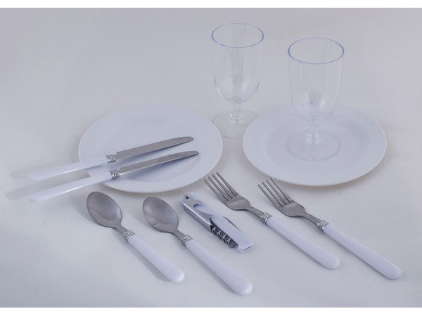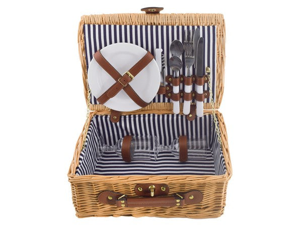 Crafted from durable wicker with a stylish 210D polyester lining, it offers a charming, rustic look with modern convenience. The basket includes 2 x sets of Stainless Steel Cutlery (Knives, Forks & Spoons), 2 x PP Plates, 2 x PP Wine Glasses, and 1 x Bottle Opener, all securely fastened with leather straps. Its compact size makes it perfect for spontaneous getaways or cosy outdoor lunches.