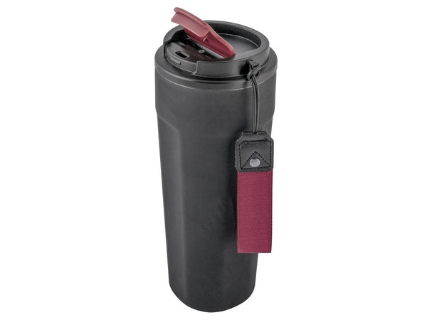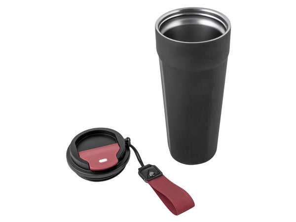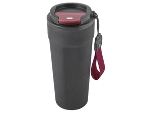 Experience on-the-go convenience and style with this sleek, insulated Double Wall 600ml travel mug, featuring a secure flip-top lid and a vibrant maroon carrying strap, perfect for keeping your drinks hot or cold while you are on the move. With a rubber coated finish, combining functionality with elegance.