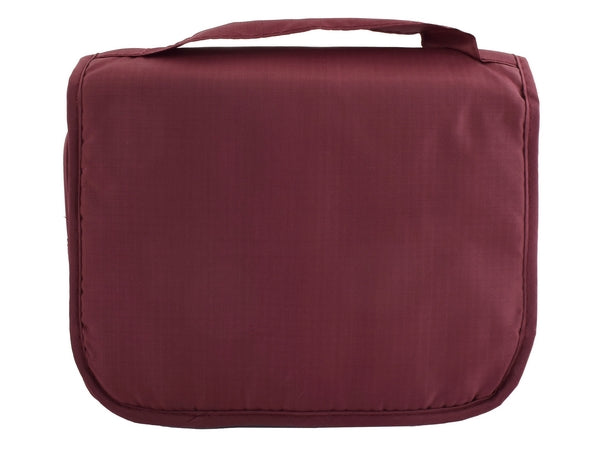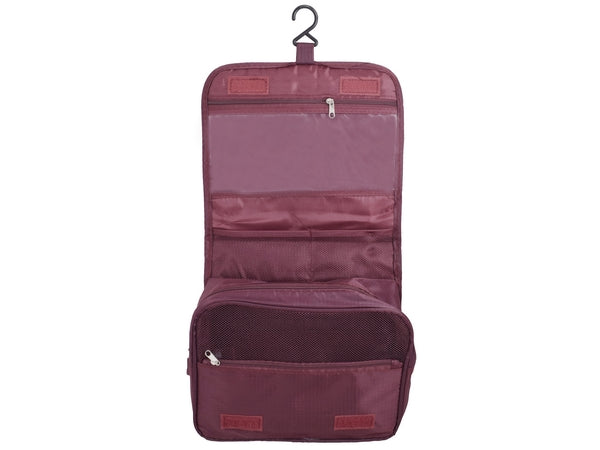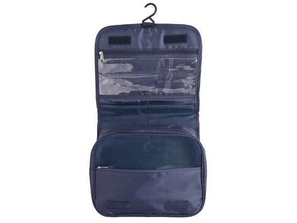 Includes Main Zip Compartment, Front Zip Pouch, Inner Zip Pouch, Inner Transparent Pouch, 4 Inner Pockets and back Pocket. Velcro close. Includes hook to hang open. With Carry Handle