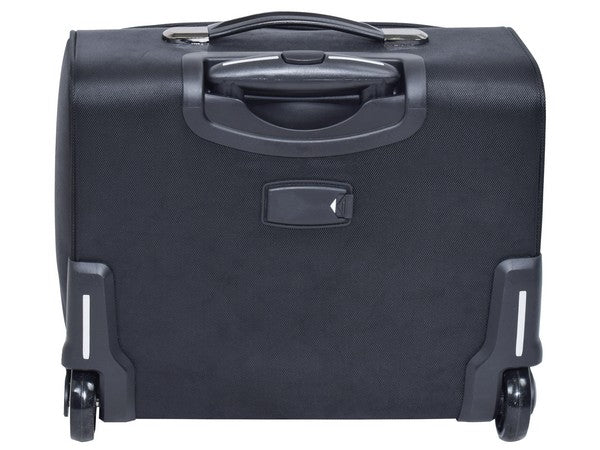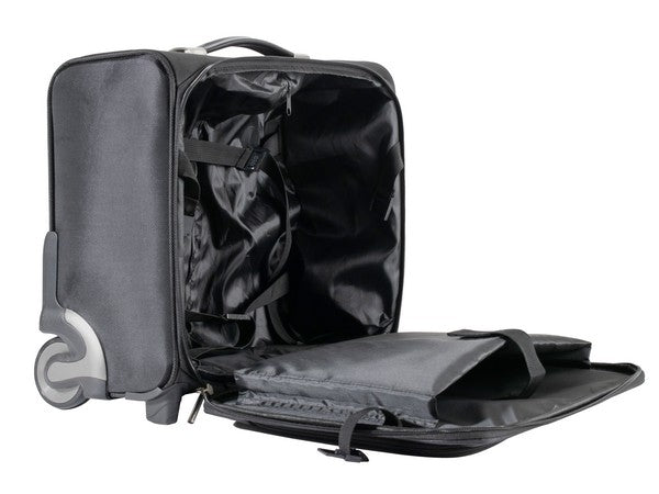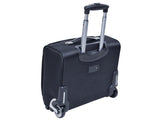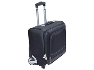 Holds 15.6 inch Laptop. Includes main zip compartment with padded laptop pocket, front zip compartment, rear name tag slot, foot stands, top carry handle, retractable aluminium handle and 2 roller wheels