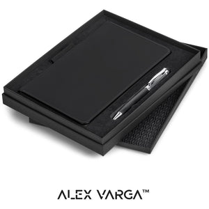 The soft and smooth, matte material of this hard cover notebook contrasts gracefully with the black metal frame, and the elasticated pen loop and painted edges finish off the product. It’s packaged together with a high performance Alex Varga Ball Pen to create a premium writing set.