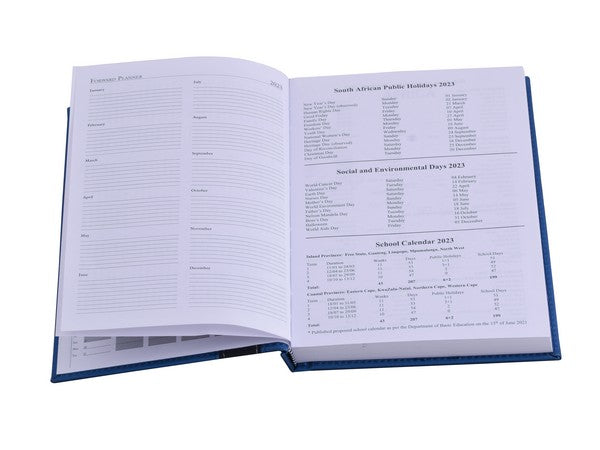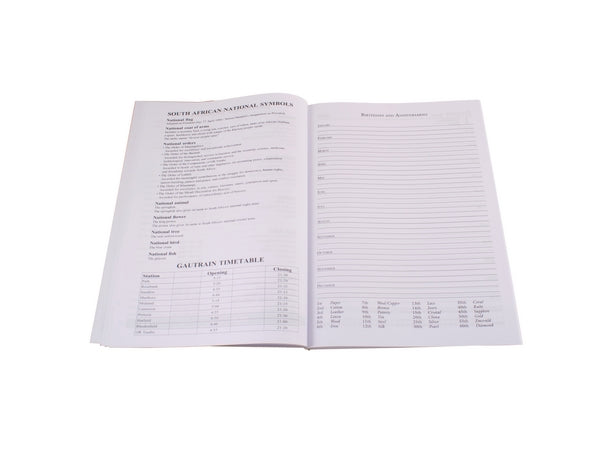 Daily Inspirational Quotes. Page-A-Day. With Satin Bookmark. Inner pages Include: Public Holidays, Social and Environmental Days, Holy Days & Religious Festivals, School Calendar, Africa Map, Emergency Numbers, International Dialling Codes, Web Directory, SA National Symbols, Gautrain Timetable