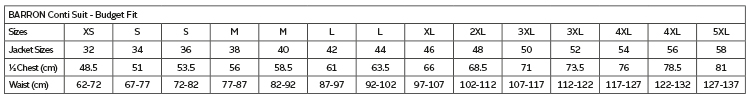 The Barron Budget Poly Cotton Conti Suit is a blended poly cotton twill fabric set that contains a long sleeve jacket and pants. Features include concealed metallic zips, two side pockets, a Monza chest pocket with top stitching throughout for added durability. While the long pants has a 1/2 elasticated waistband, two side pockets, a back pocket and has triple stitching along the legs, back and front rise. Available in a variety of great colors and sizes. Budget fit.