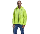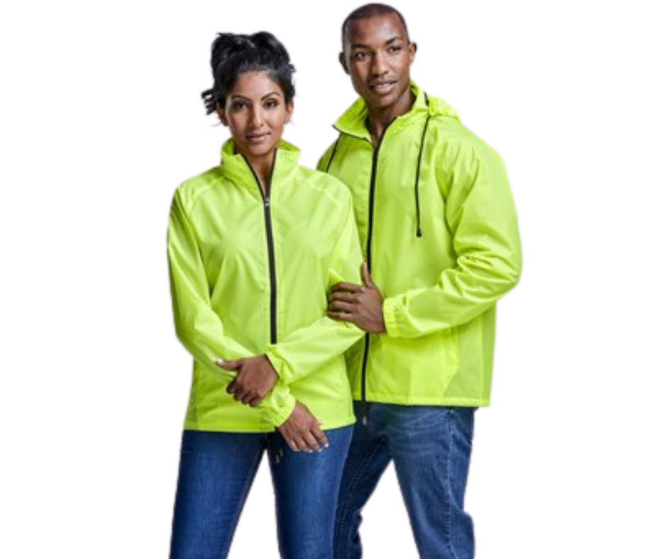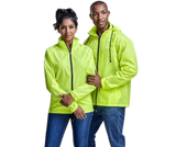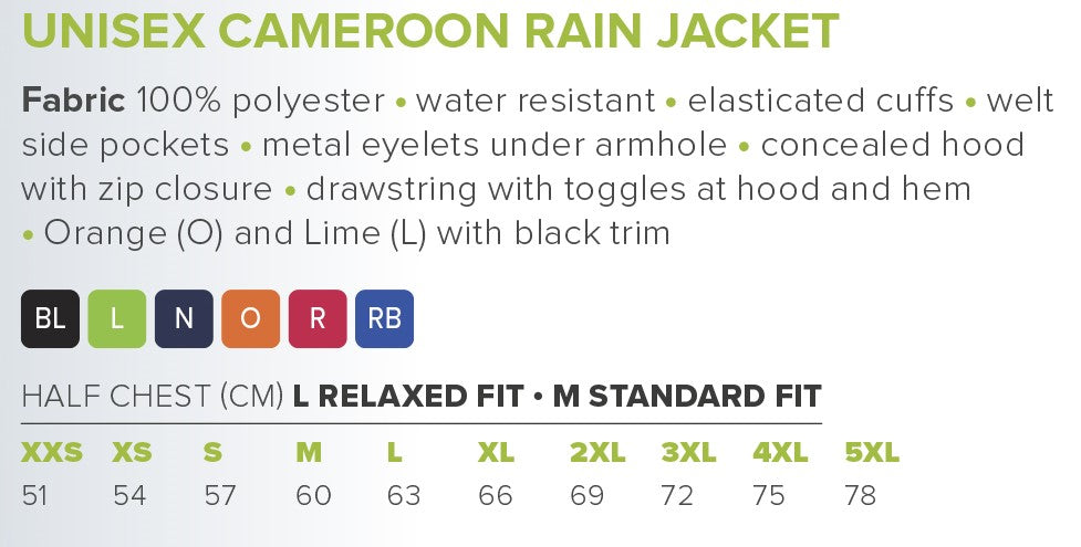 The Unisex Cameroon Rain Jacket is made from 100% polyester with a full front zipper. The jacket is water-resistant with elasticated cuffs, welt side pockets, a hood that folds up into a zip closure and drawstrings on the inside of the hem and hood. Available in different colors and multiple sizes.