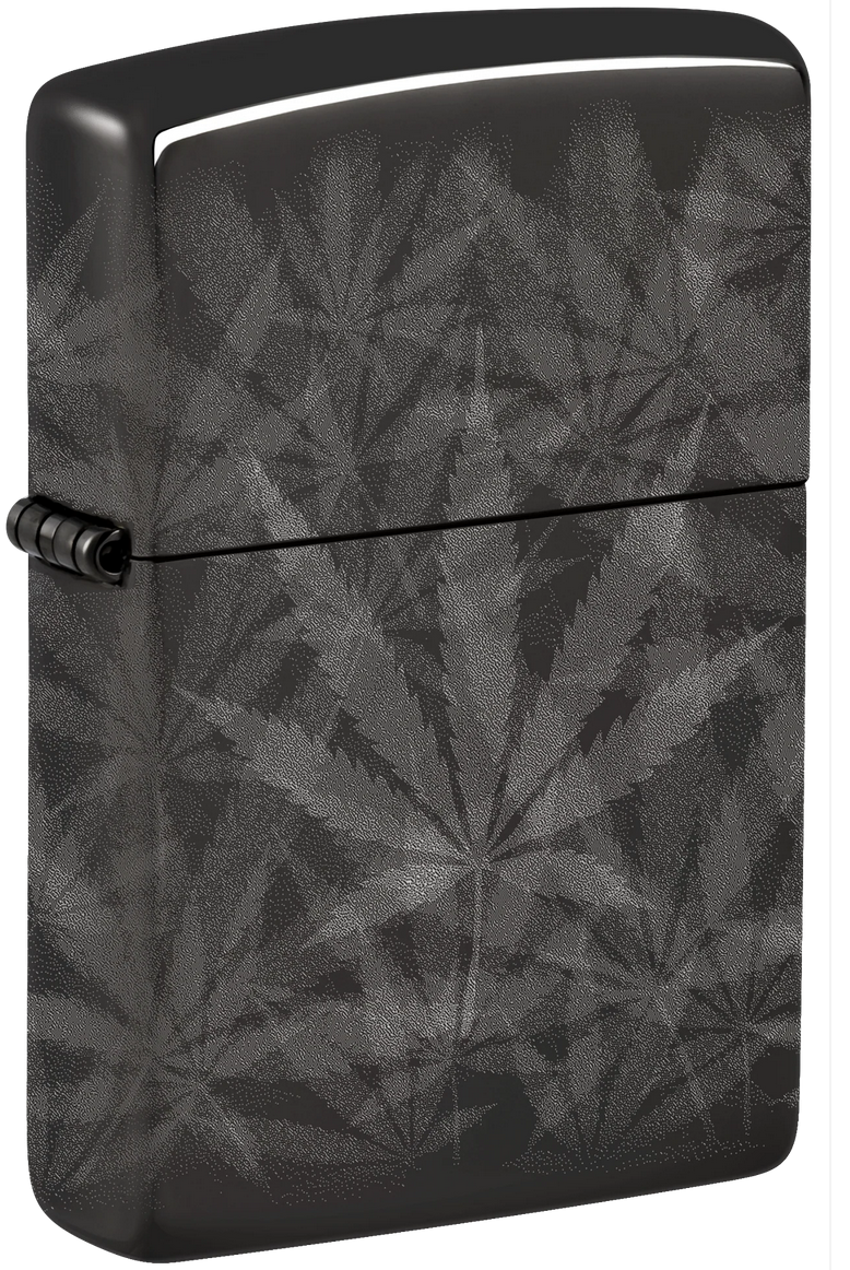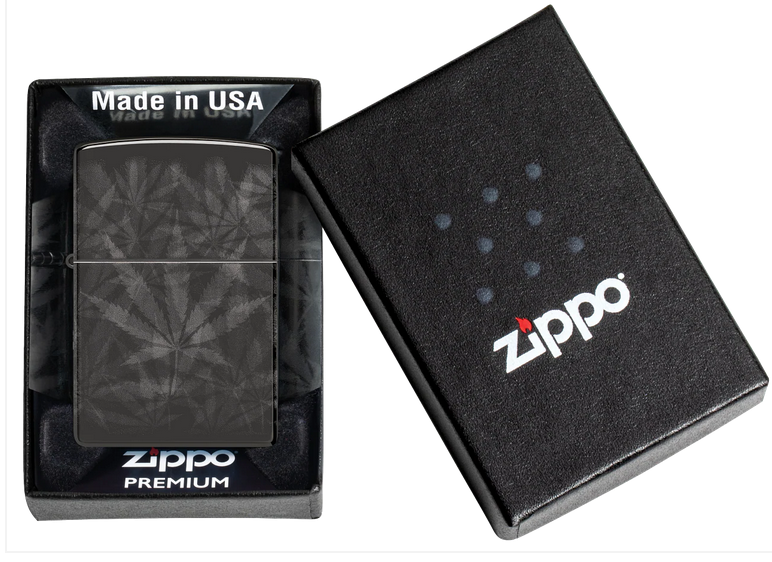 Cannabis leaves cascade around all sides of this High Polish Black lighter in a subtle and smoky Photo Image 360° design. Comes packaged in a gift box. For optimal performance fill with Zippo lighter fuel.