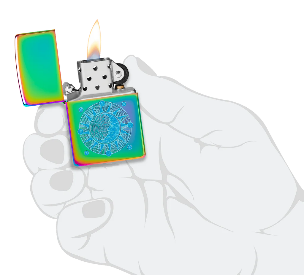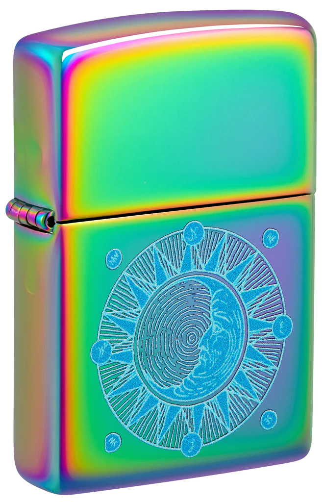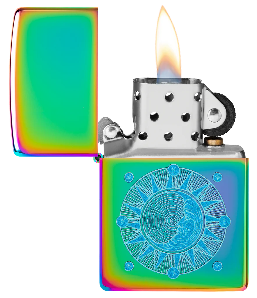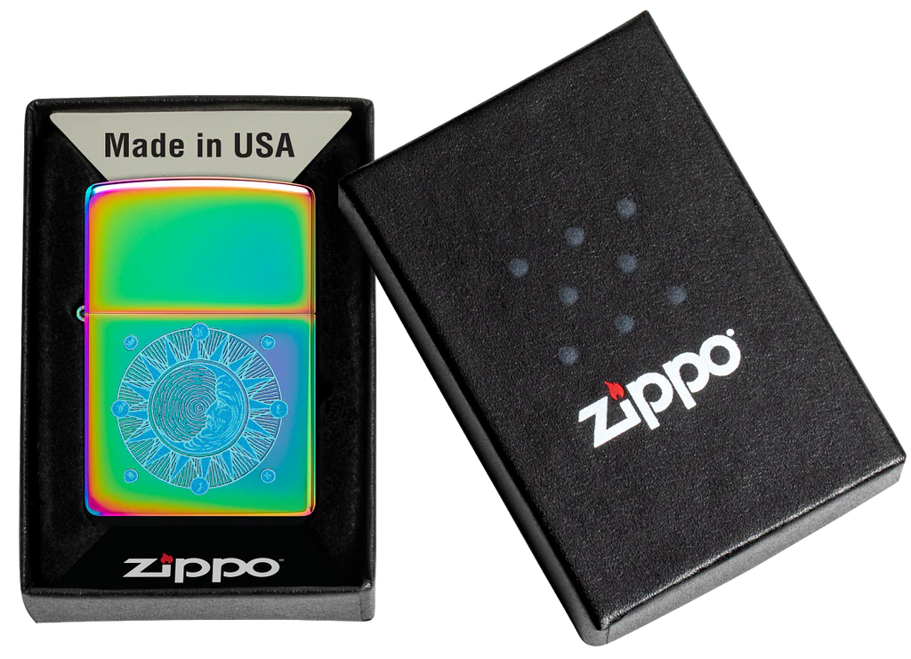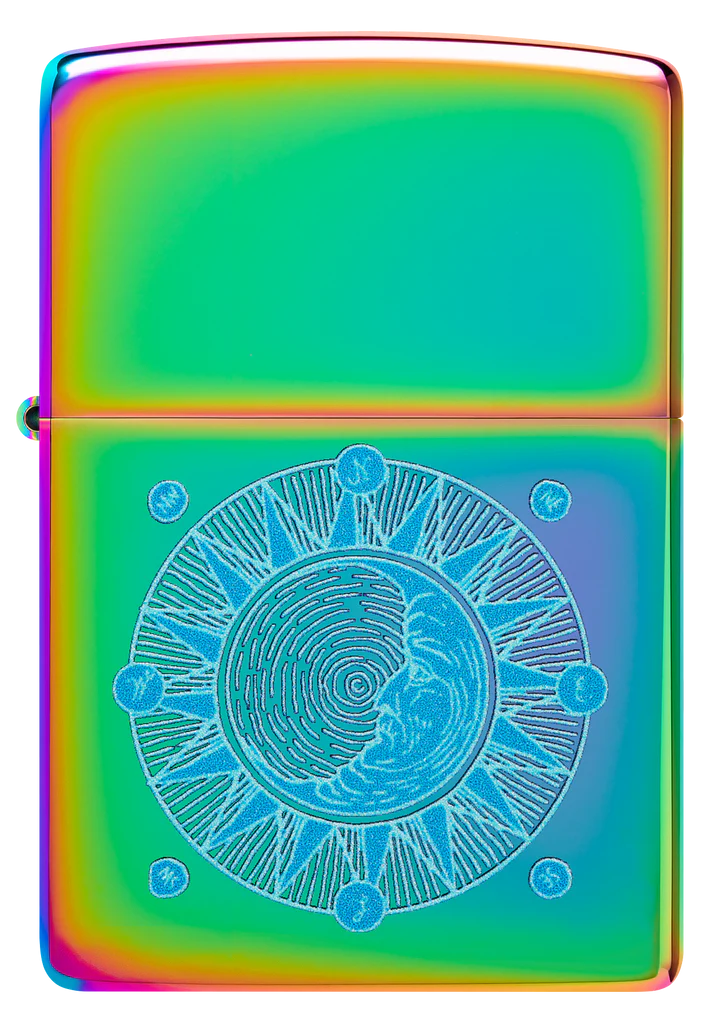 The sun and moon hang in perfect balance on this mesmerizing Multi Color lighter in a harmonious Color Image design. Comes packaged in a gift box. For optimal performance fill with Zippo lighter fuel.