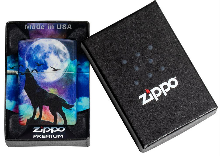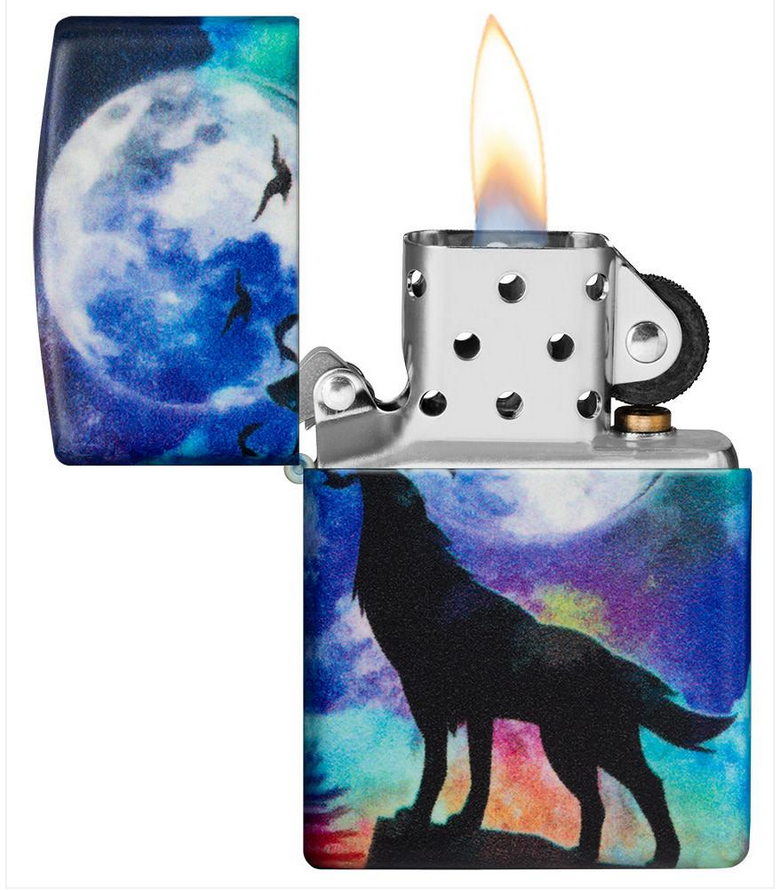 Attention all wolf fans, do we have a lighter for you. This design depicts wolf silhouettes howling to a brilliant full moon flying high in a blue night sky. This wild design is created using the 540 Color process, which allows for complete coverage of the lighter's surface with precision artwork. Vivid colors shine off this brilliant Wolf Design, making this a must-have for your collection! Comes packaged in a gift box. For optimal performance fill with Zippo lighter fuel.