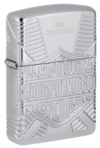 Nothing makes an entrance like a Harley Motorcycle, and the 2022 Harley-Davidso® Collectible is just as hard to miss. The Armor® High Polish Chrome lighter features the iconic bar-and-shield logo front and center using our MultiCut process. The deep, intricate design continues on both sides and around to the back, where you’ll find the classic Willie G skull surrounded by black epoxy. This luxury showpiece is perfect for Zippo and Harley-Davidson fans alike and is prominently laser-engraved as the 2022 Collectible.Comes packaged in a gift box. For optimum performance, fill with Zippo lighter fuel.