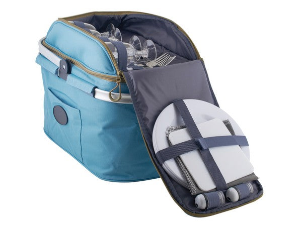 The caddy includes 4 x Stainless Steel Cutlery (Forks, Knives & Spoons), 4 x PS Wine Glasses, 4 x Cotton Napkins, 4 x PS Plates (9 inch), 2 x Plastic Salt & Pepper Shakers, 1 x Stainless Steel Bottle Opener and 1 x Stainless Steel Cheese Knife. The inner cooler bag keeps your food fresh, and drinks chilled for hours. Its compact yet spacious design and aluminium handle makes it easy to carry, while the sturdy aluminium frame ensures stability