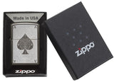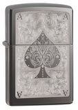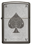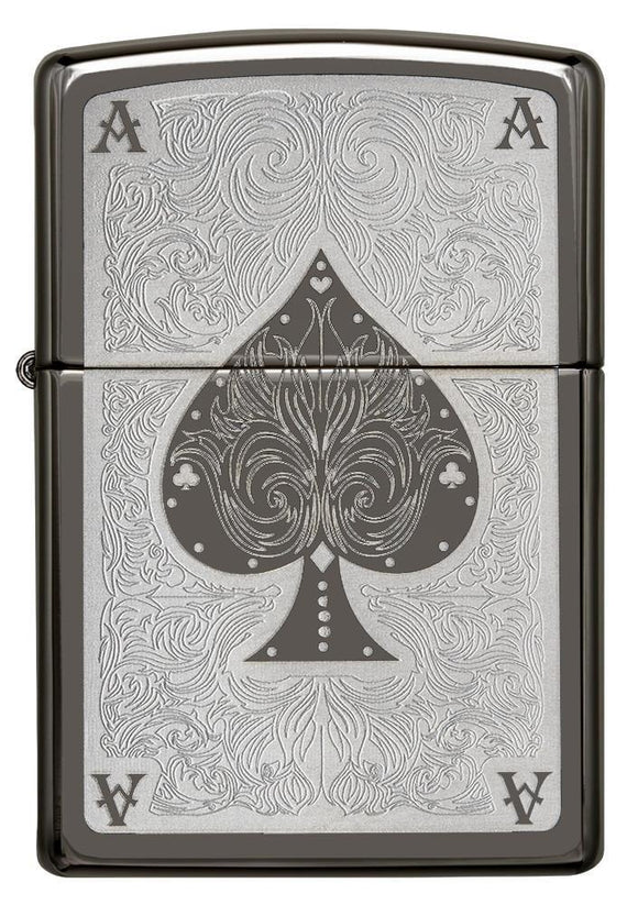 This Black Ice windproof lighter uses both laser and auto engrave imprint methods to create this beautiful ace of spades filigree design. Comes packaged in a gift box. For optimal performance, fill with Zippo lighter fuel.
