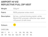 Be safe and visible day and night with our Airport Hi-Viz Reflective Full Zip Vest. Crafted with 120g/m2 100% polyester Airtex mesh and featuring contrast binding detail and white 50mm PVC prismatic reflective tape for enhanced visibility, this vest also includes an ID pouch for convenient storage. Ready to help you be seen, whatever the conditions.