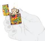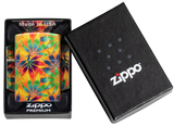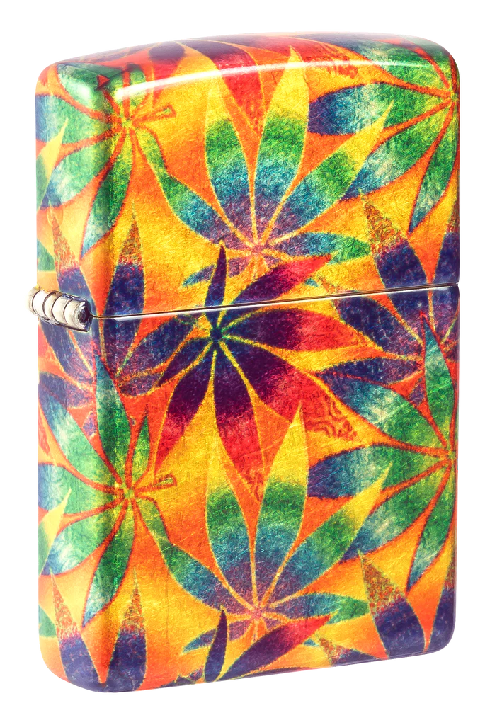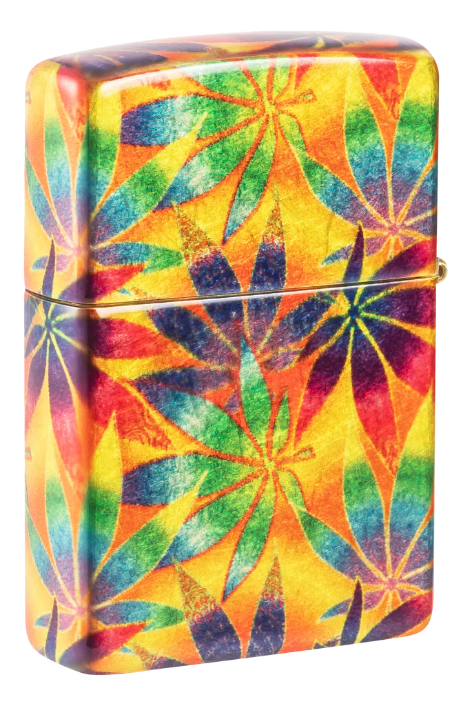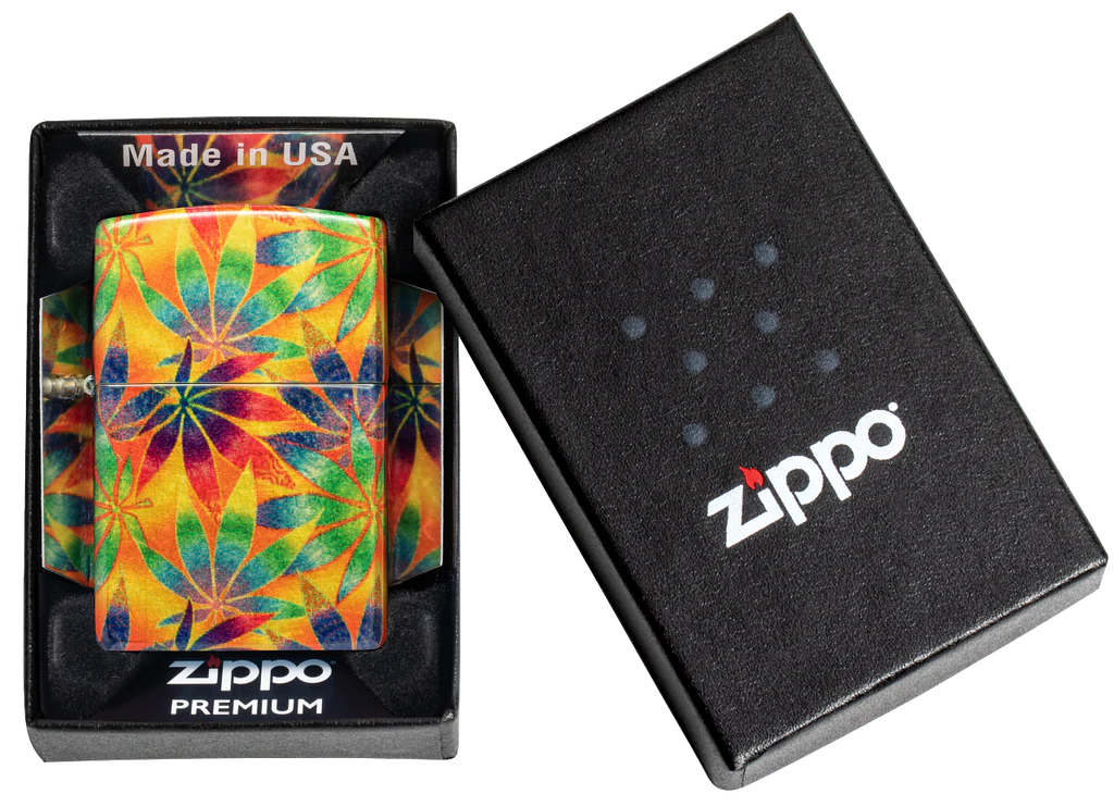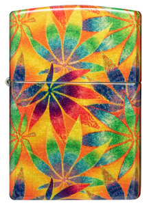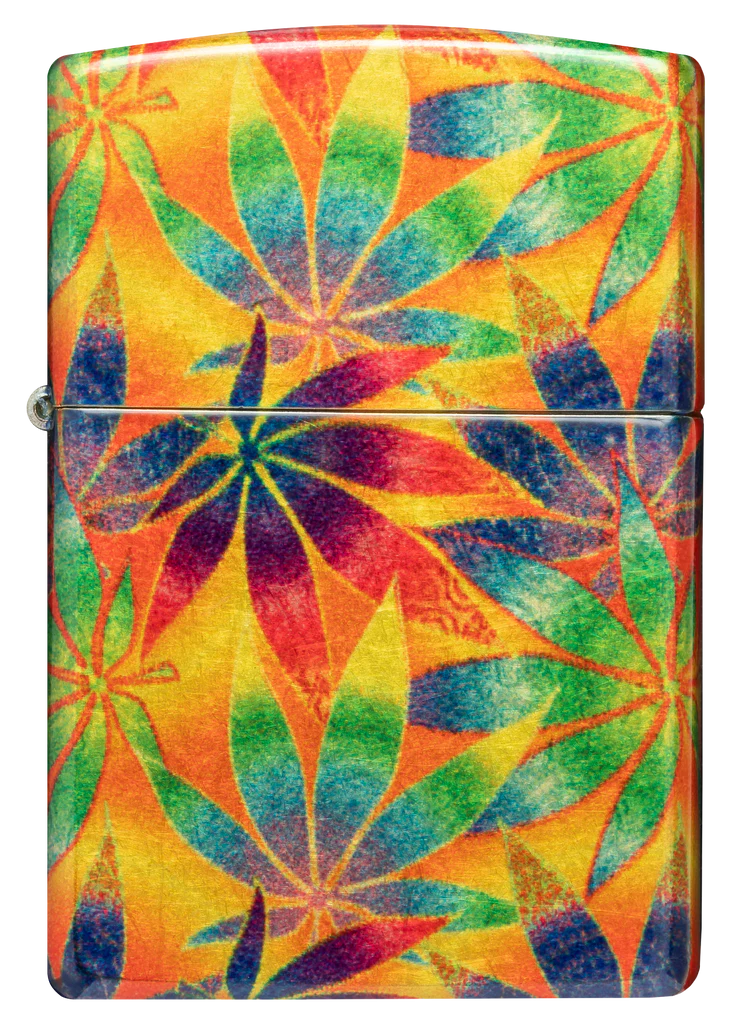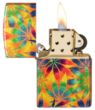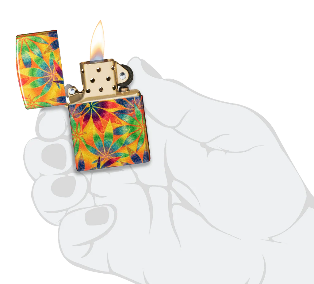 Colorful cannabis leaves cascade around all sides of this gorgeous 540 Fusion lighter. The seamless design incorporates the rich brass tones of the lighter beneath for added shimmer. Comes packaged in a gift box. For optimal performance, fill with Zippo lighter fuel.