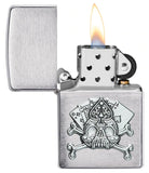 The Royal Flush is the most sought after hand in poker. However, few ever see it with their own eyes. Fashioned to a Brush Chrome lighter is an emblem that features that improbable poker hand, a spade, above a skull and crossbones. Comes packaged in a gift box. For optimal performance, fill with Zippo lighter fuel.