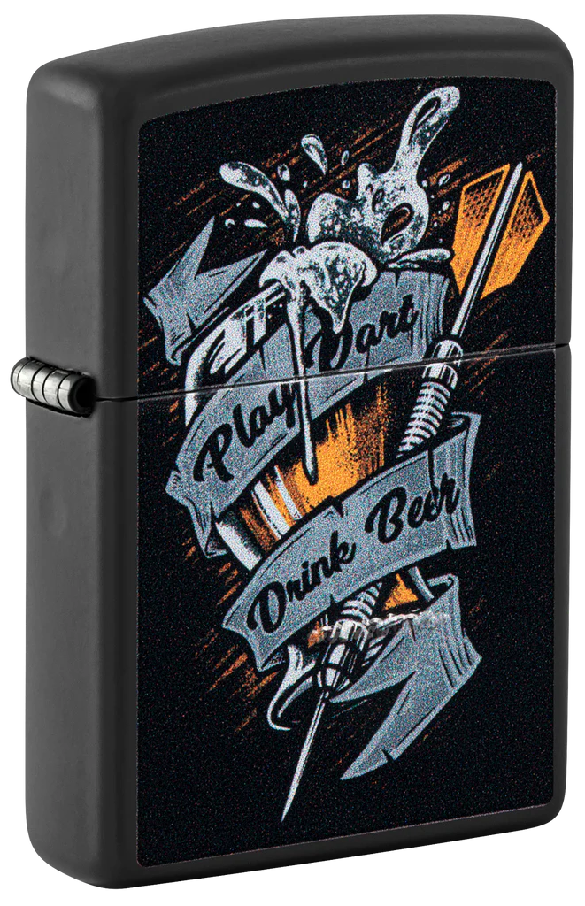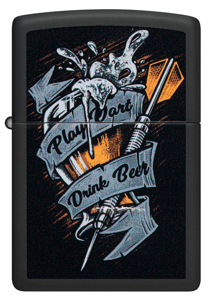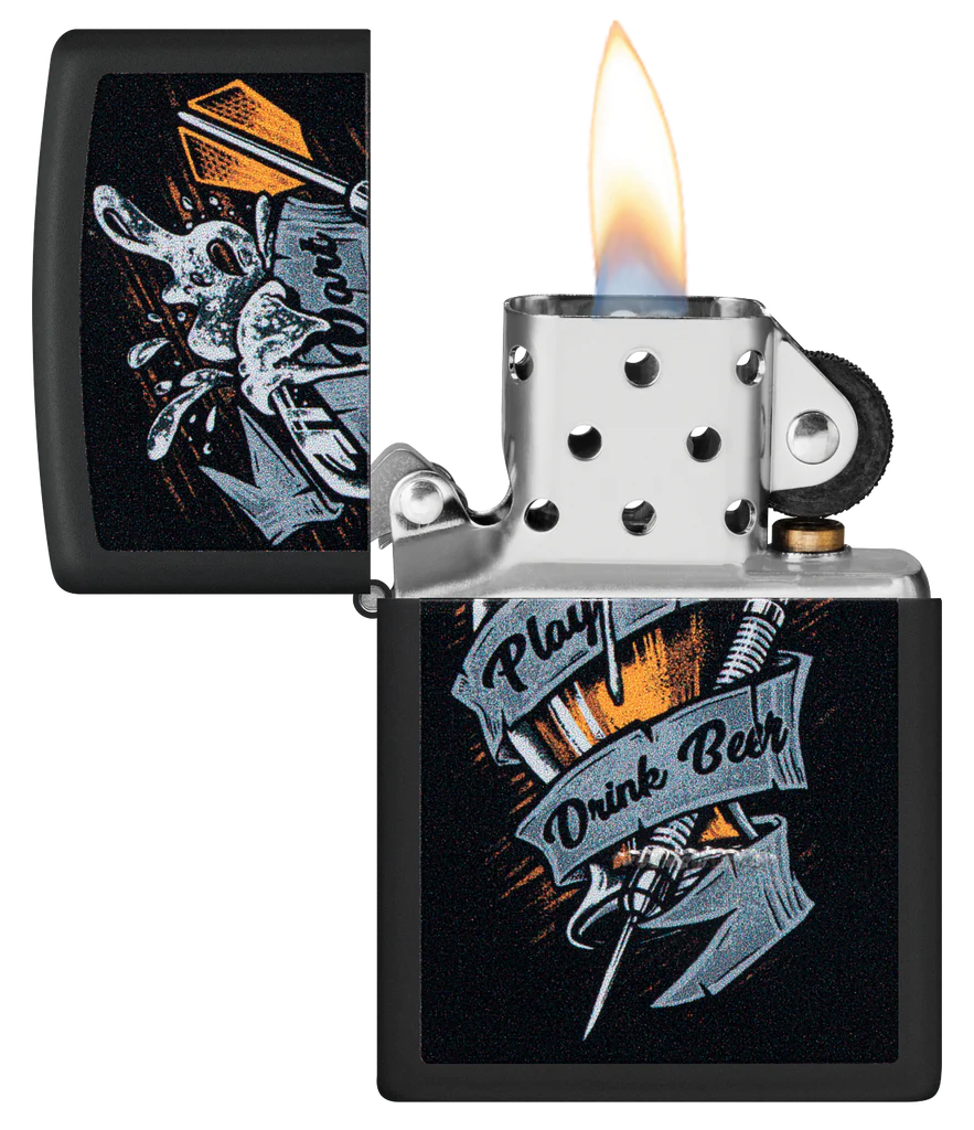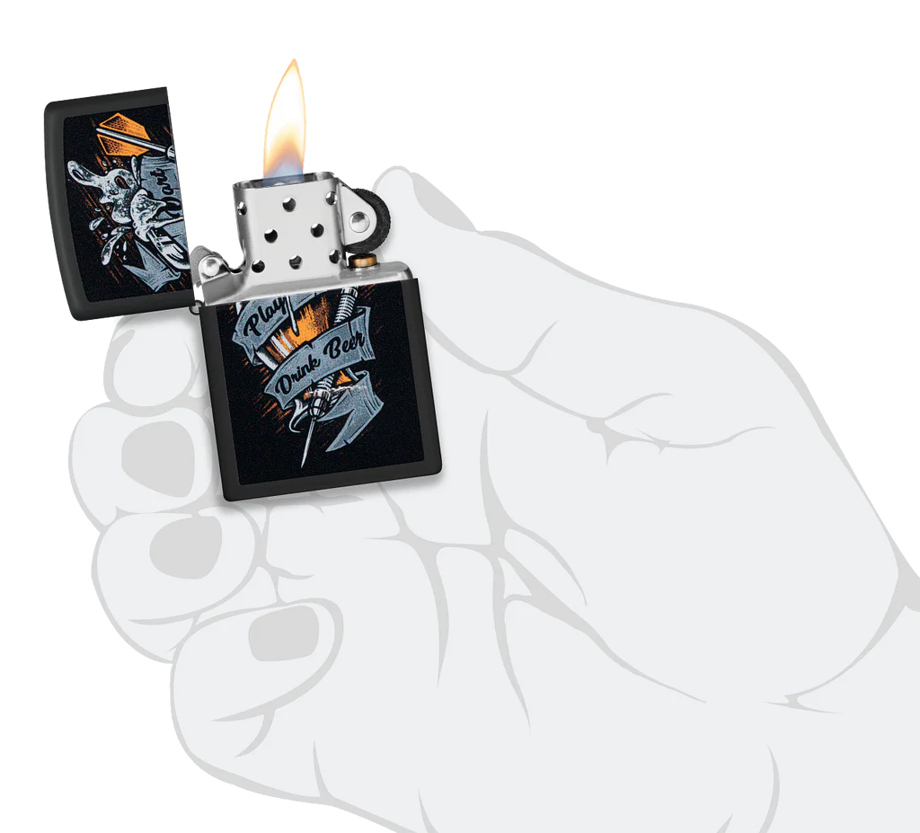 If you're not ready to commit to a tattoo of your favorite motto, you can at least carry it with you on this Black Matte lighter. The vibrant Color Image design depicts the recipe for a fun evening in a tattoo-inspired style. Comes packaged in a gift box. For optimal performance, fill with Zippo lighter fuel.