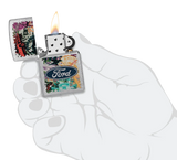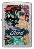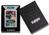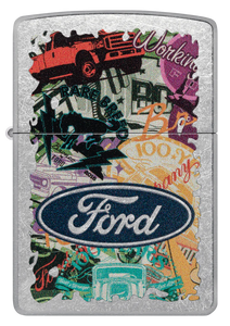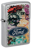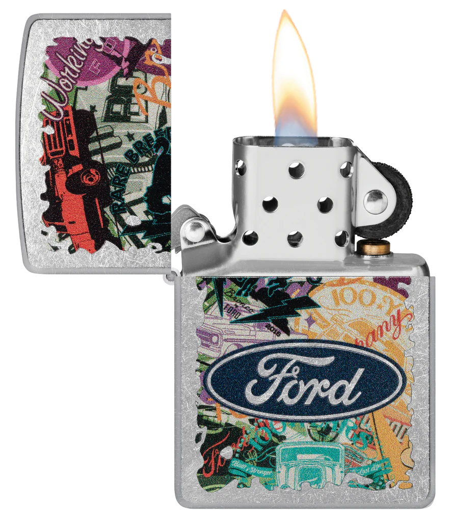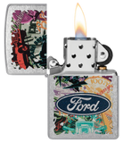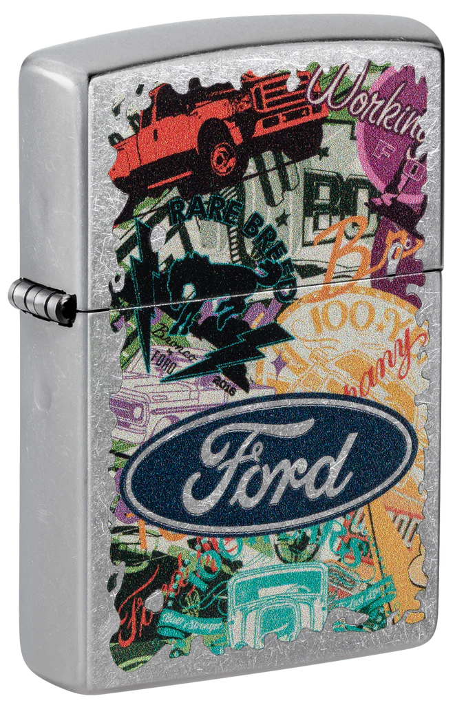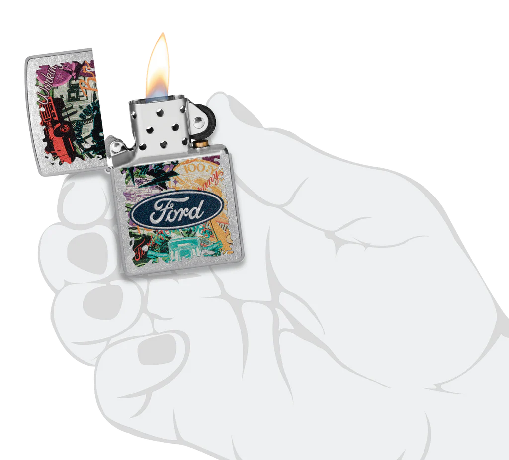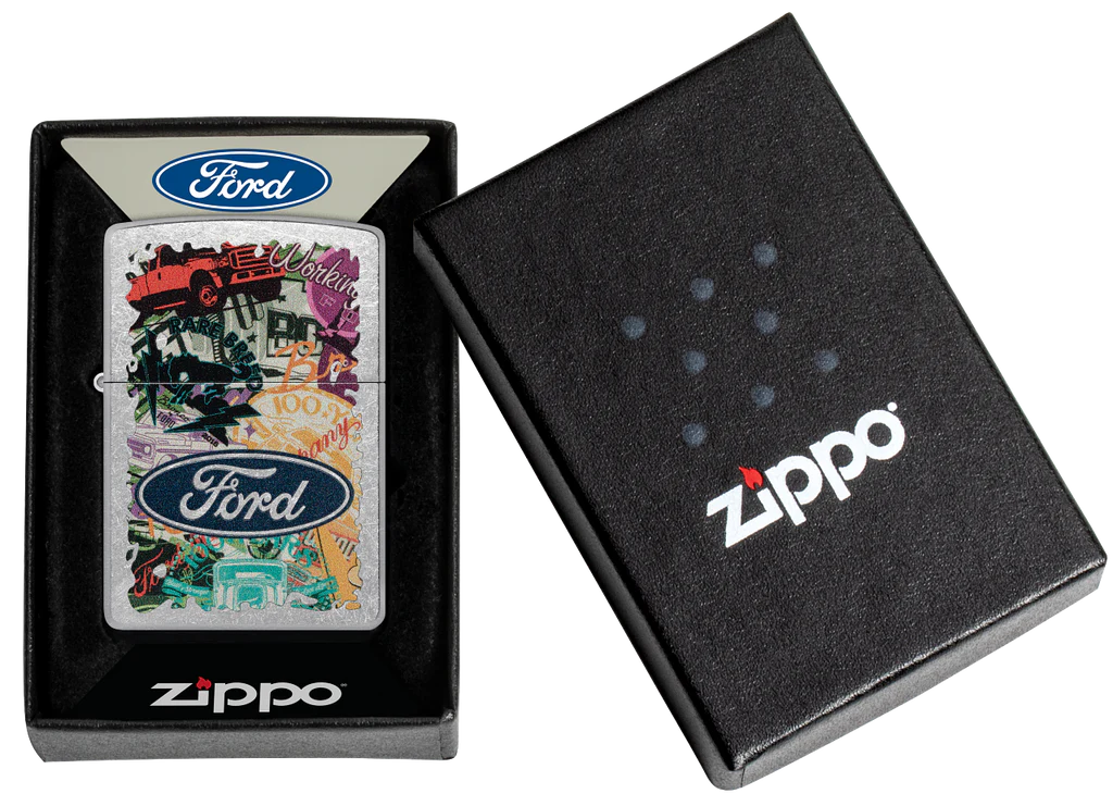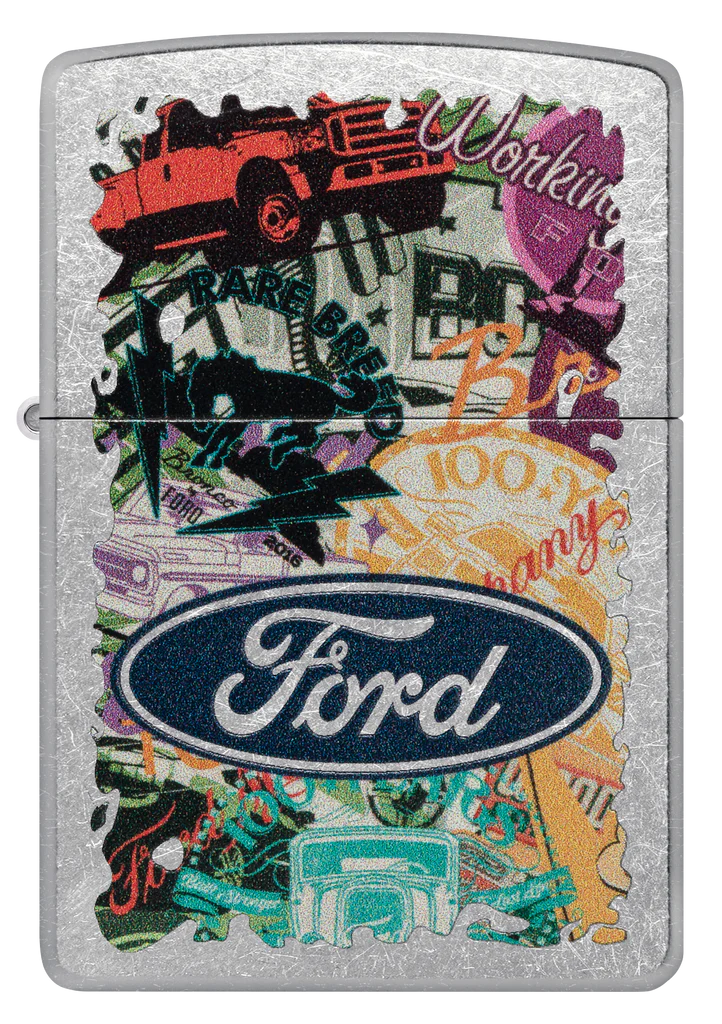 Hit the road and take in the sights with this Street Chrome lighter. The Ford® logo stands proudoy over a bold collage of classic brand icons and milestones in an adventure-ready Color Image design. Comes packaged in a gift box. For optimal performance fill with Zippo lighter fuel.