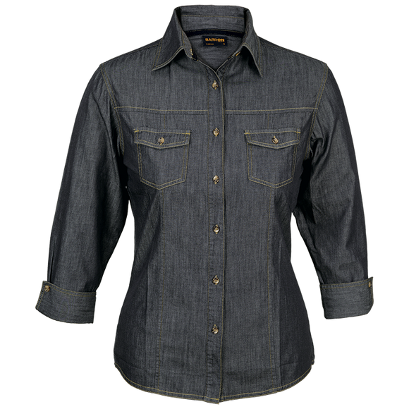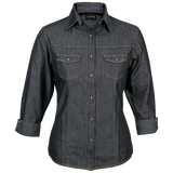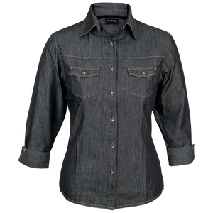 The Ladies Denver Denim Blouse is made from 100% Cotton dark denim fabric, 5 Oz. The features include a shaped hem for a flattering look, two-tone buttons, matching ladies denim blouse, patch pocket with flaps at the chest, constructed button stand, contrast top stitching, double layer back yoke, front and back panel lines, ¾ sleeve styling and turn-up cuffs. Regular fit.
