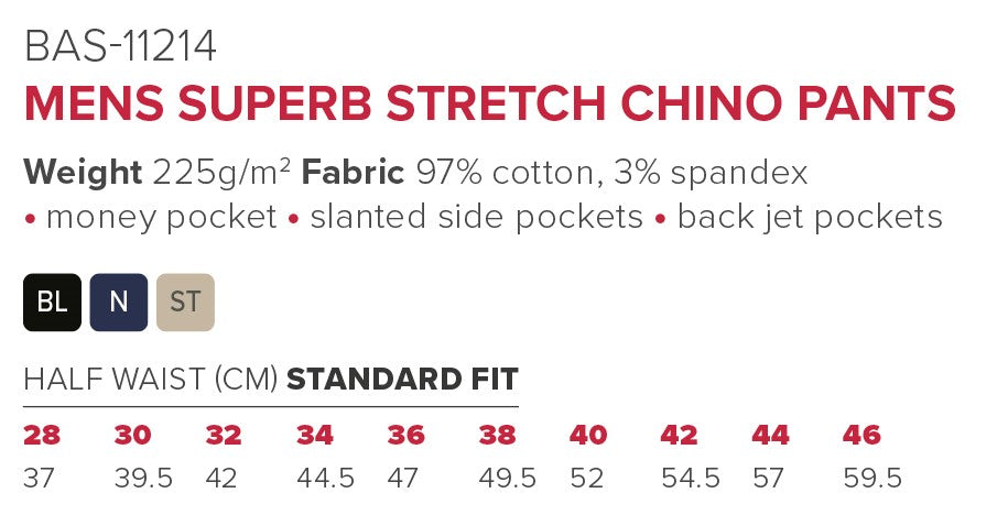 The Mens Superb Stretch Chino Pants is both comfortable and stylish enough to wear in the office or on a night out can be worn with your favorite button-up or regular t-shirt! Made from 225g/m2 97% polyester and 3% spandex, the formal pants has slanted side pockets, back jet pockets, a money pocket and belt loops. Available in plain colors. Standard fit.