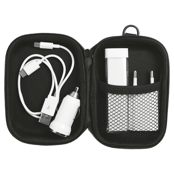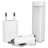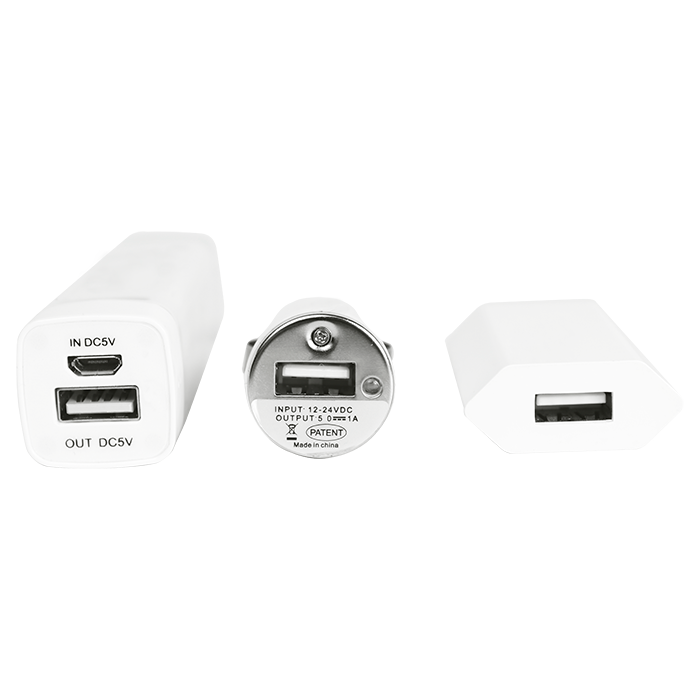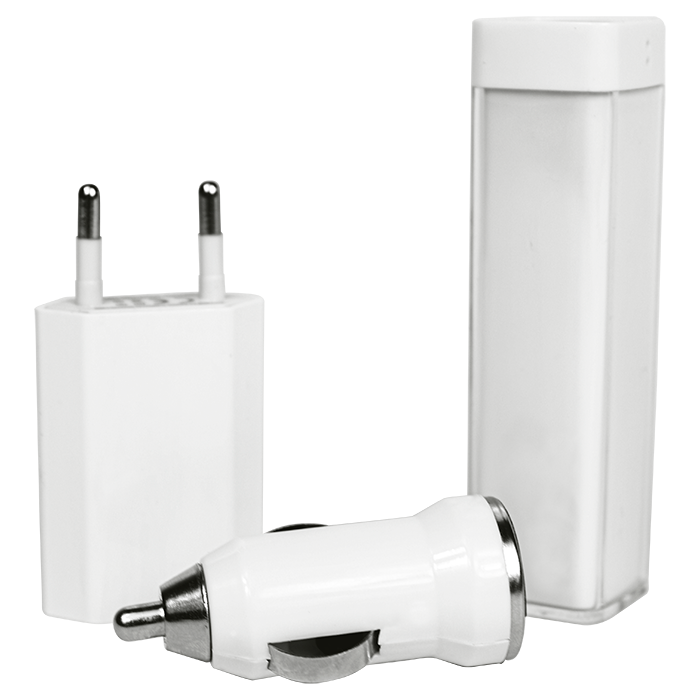 - Travel kit: 2200mAh Power bank, USB car charger, 2 pin plug, USB phone charger, 2-in-1 USB cable