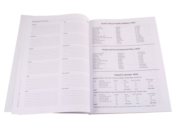 Daily Inspirational Quotes. Page-A-Day. With Satin Bookmark.Inner pages Include: Public Holidays, Social and Environmental Days, Holy Days & Religious Festivals, School Calendar, Africa Map, Emergency Numbers, International Dialling Codes, Web Directory, SA National Symbols, Gautrain Timetable.