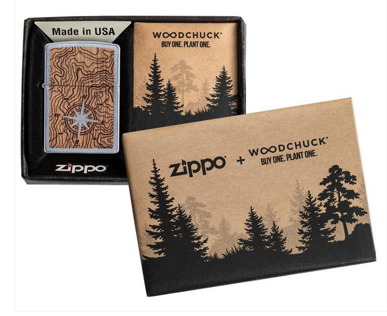 Zippo, in partnership with WOODCHUCK, USA and their BUY ONE. PLANT ONE.® program, will plant one tree for every lighter sold. These lighters are created using laser-cut emblem designs, made from 100% real wood, that will help restore and protect the forests of the world. Consumer can use the special code in each box to learn where their trees are planted. This Street Chrome lighter features a two-sided ultralite chip emblem featuring a Compass. Always pointing you in the right direction. Comes packaged in a unique display box; showcasing the face of the lighter and code described above. For optimal performance, fill with Zippo lighter fuel.
